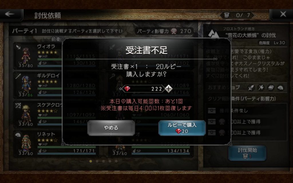 1日1回のみ20ルビーで受注書を購入することができます。