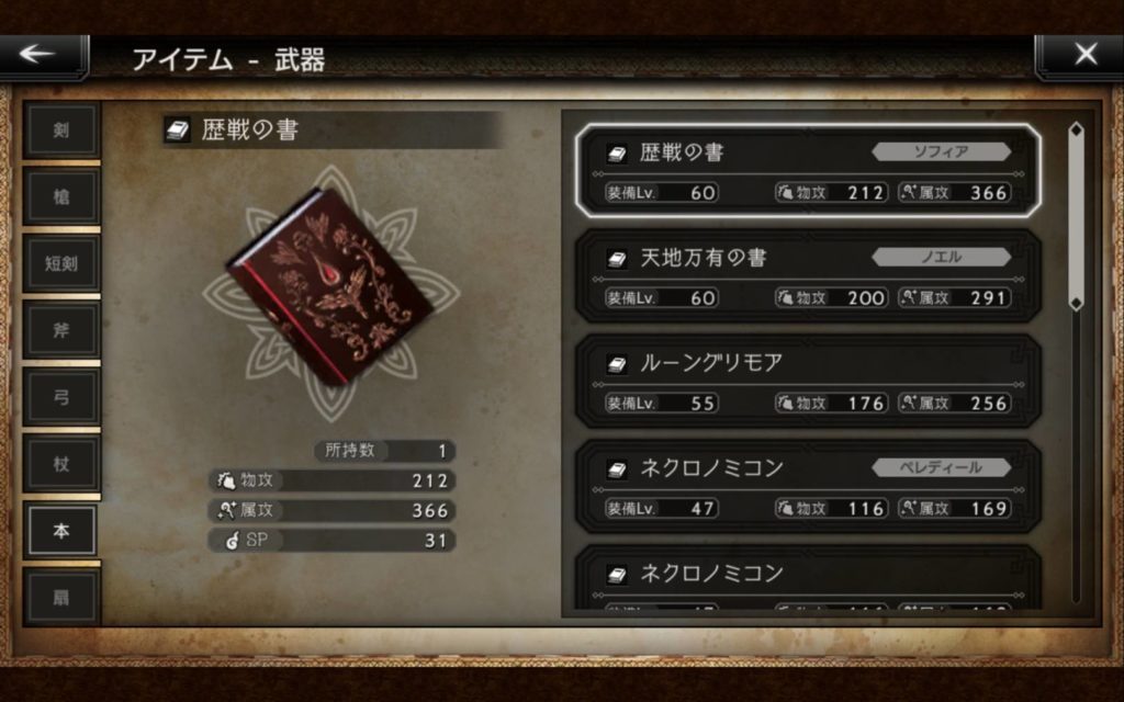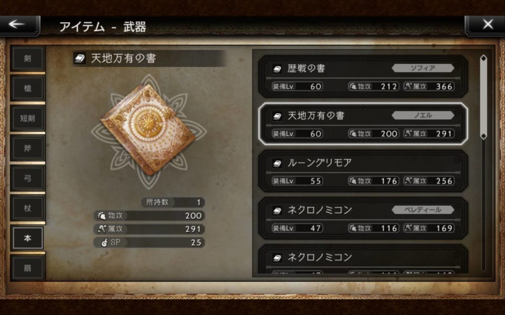 同レベル帯の歴戦の書を除くと現状最強武器の天地万有の書との比較です。