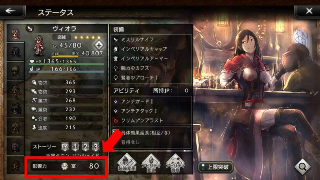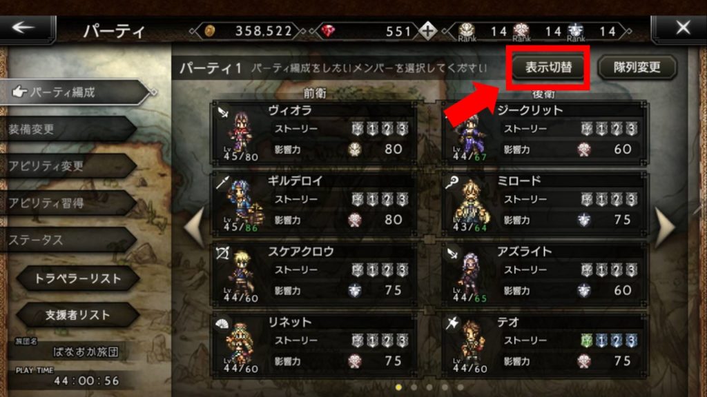 パーティの表示切替からでも全員の影響力を確認することが可能です。